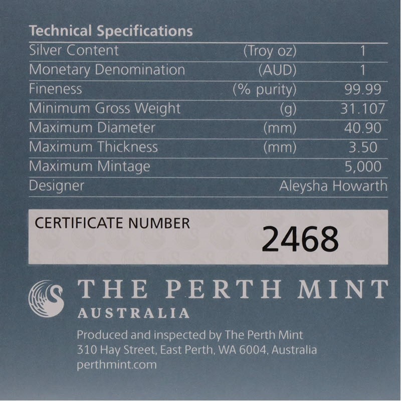 На аверсе изображен Его Величество король Чарльз III. Внизу портрета инициалы дизайнера TD (Dan Thorne). Вдоль канта надпись: CHARLES III AUSTRALIA · 1oz 9999 Ag 1 DOLLAR · (Чарльз III, страна-эмитент, вес и проба серебра, номинал).