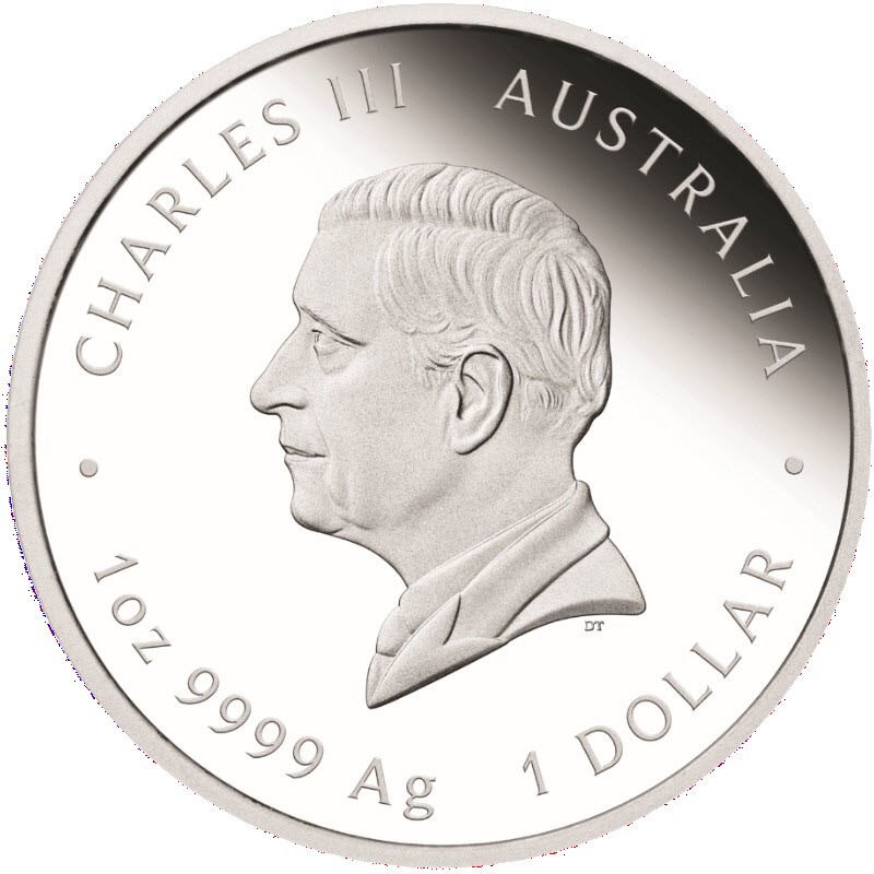 На аверсе изображен Его Величество король Чарльз III. Внизу портрета инициалы дизайнера TD (Dan Thorne). Вдоль канта надпись: CHARLES III AUSTRALIA · 1oz 9999 Ag 1 DOLLAR · (Чарльз III, страна-эмитент, вес и проба серебра, номинал).