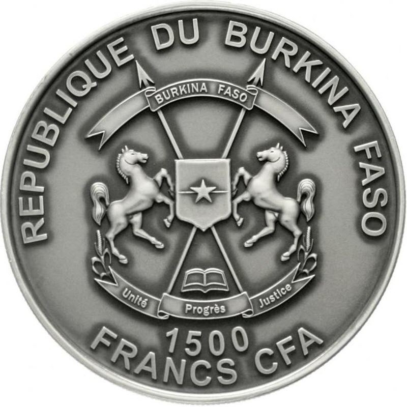 На аверсе изображен герб Буркина-Фасо. Внизу герба девиз: Unité Progrès Justice (Единство, Прогресс, Правосудие). Вдоль канта надпись: REPUBLIQUE DU BURKINA FASO 1500 FRANCS CFA (страна-эмитент, номинал).