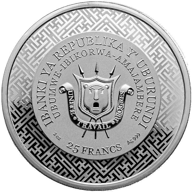 На аверсе монеты изображен герб Бурунди, окруженный узорным полем с мерцающим эффектом голограммы. Вокруг герба надписи: IBANKI YA REPUBLIKA Y' UBURUNDI 2 oz 25 FRANCS Ag 999 (страна-эмитент, вес и проба серебра, номинал).