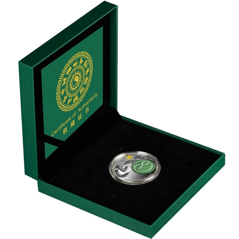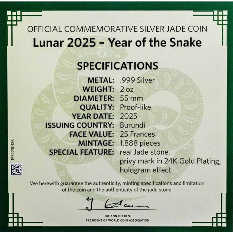 Эта серебряная монета Бурунди «Год Змеи» весом в 2 унции серебра – третья из серии "Нефритовый Лунар". На монете 4 змеи: серебряная, золотая на метке из 24 каратного золота, нефритовая, вырезанный на камне, и иероглиф-змея. У нее качество пруф, поставляется в оригинальном футляре с сертификатом подлинности. Тираж 1888 штук.