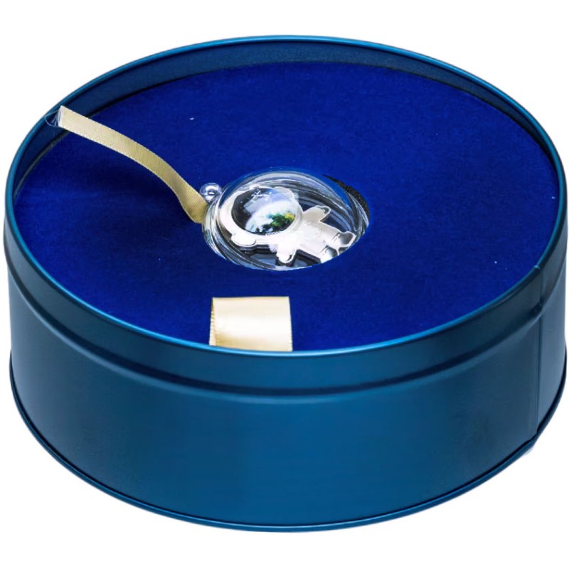 Выполнен в виде скафандра астронавта. Через "стекло шлема" виден цветной фрагмент изображения Земли и космического пространства.