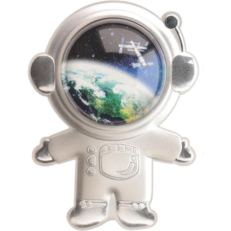 Эта прекрасная серебряная монета выполнена в форме астронавта и посвящена теме исследования космоса.