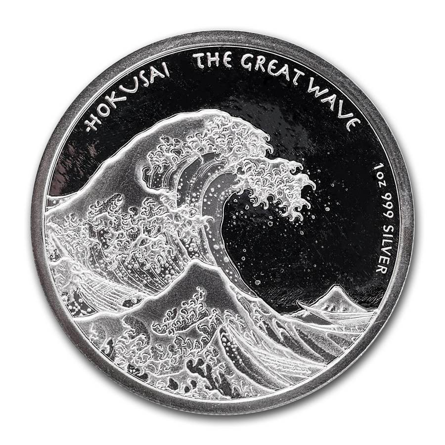На реверсе изображен фрагмент картины Хокусая «Большая волна в Канагаве», на которой бушующая морская стихия вот-вот обрушится на лодки у побережья префектуры Канагава. По ободу в центре обозначено название монеты - «HOKUSAI THE GREAT WAVE» (Хокусай. Большая волна), а справа – указаны вес, проба и название металла, из которого сделана монета – «1 oz 999 SILVER» (вес – 1 унция, проба 0,999, серебро).