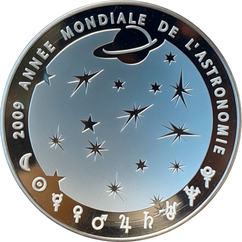 В центре - художественная композиция, изображающая космическое пространство. Эта сторона монеты имеет вогнутую форму и специальное матовое покрытие («clouded finish»), которое создает эффект глубокого ночного неба. По окружности - надпись на французском языке: 2009 ANNÉE MONDIALE DE L'ASTRONOMIE (2009 — Международный год астрономии) и астрологические символы созвездий.