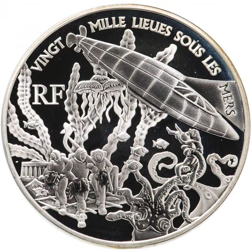 На реверсе изображен «Наутилус», водолазы и гигантский кальмар. Вверху надпись: VINGT MILLE LIEUES SOUS LES MERS (20000 лье под водой). Слева: RF (Республика Франция).