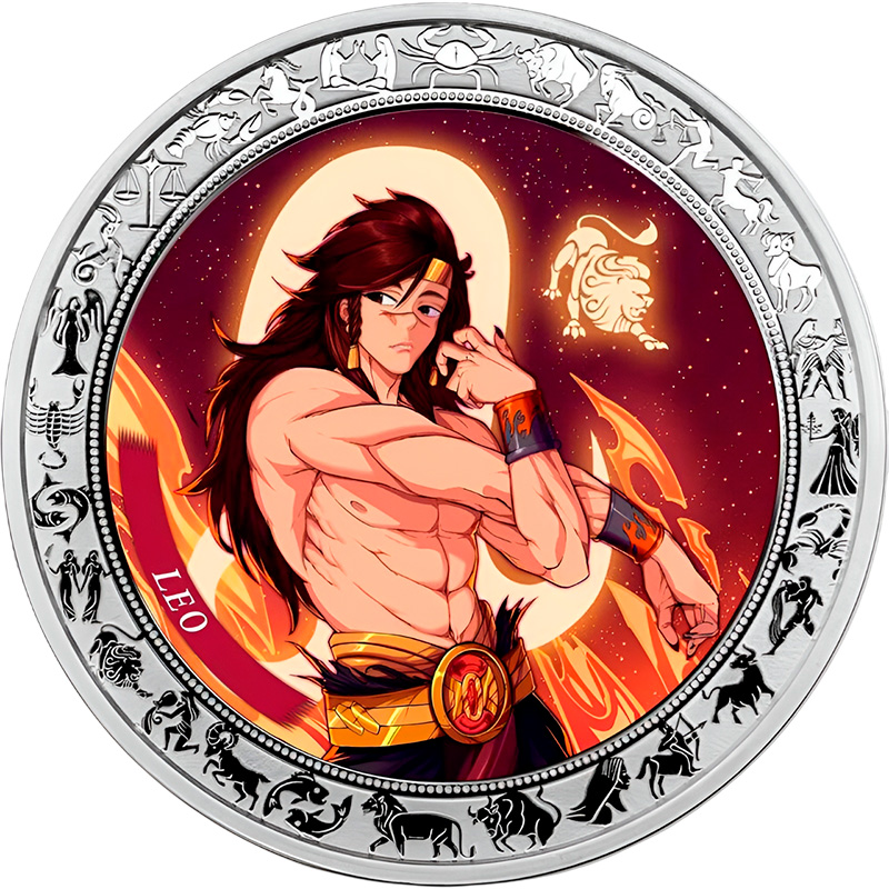 Эта красивая серебряная монета из серии “Аниме Зодиак“ посвящена пятому астрологическому знаку зодиака - “Лев” (Leo). Считается, что к нему принадлежат рождённые с 23 июля по 22 августа. Львы обладают даром созидания и настойчивостью в достижении своих целей. Это деятельные натуры, стремящиеся к успеху и популярности. Львы великодушны, решительны и храбры. Ярко выраженный талант организатора помогает им добиваться высоких целей.