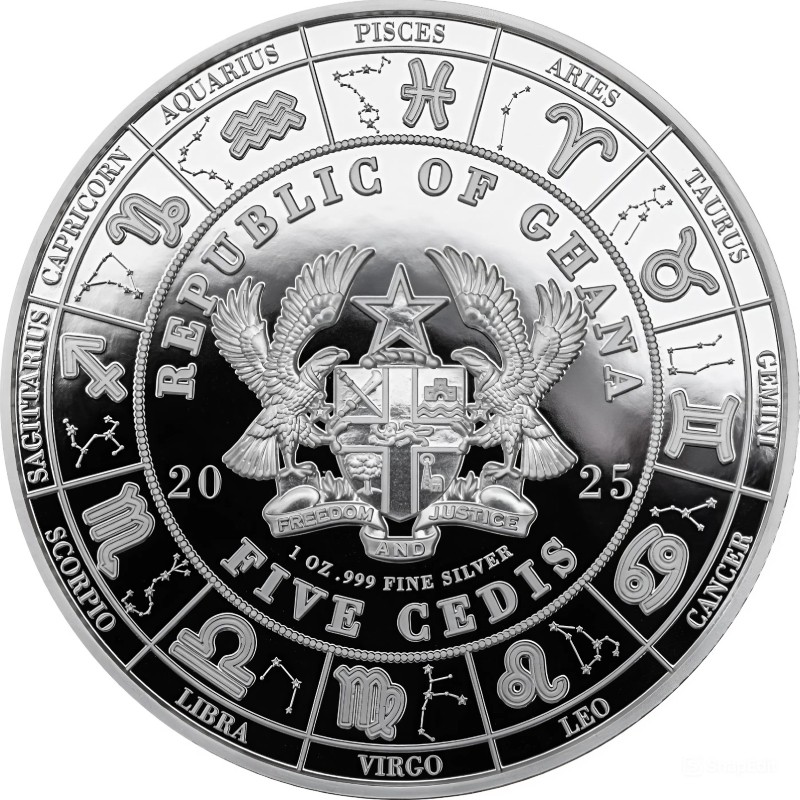 Серебряная монета Ганы "Космос Зодиак. Дева" 2025 г.в. (пруф), 31.1 г чистого серебра (проба 999)