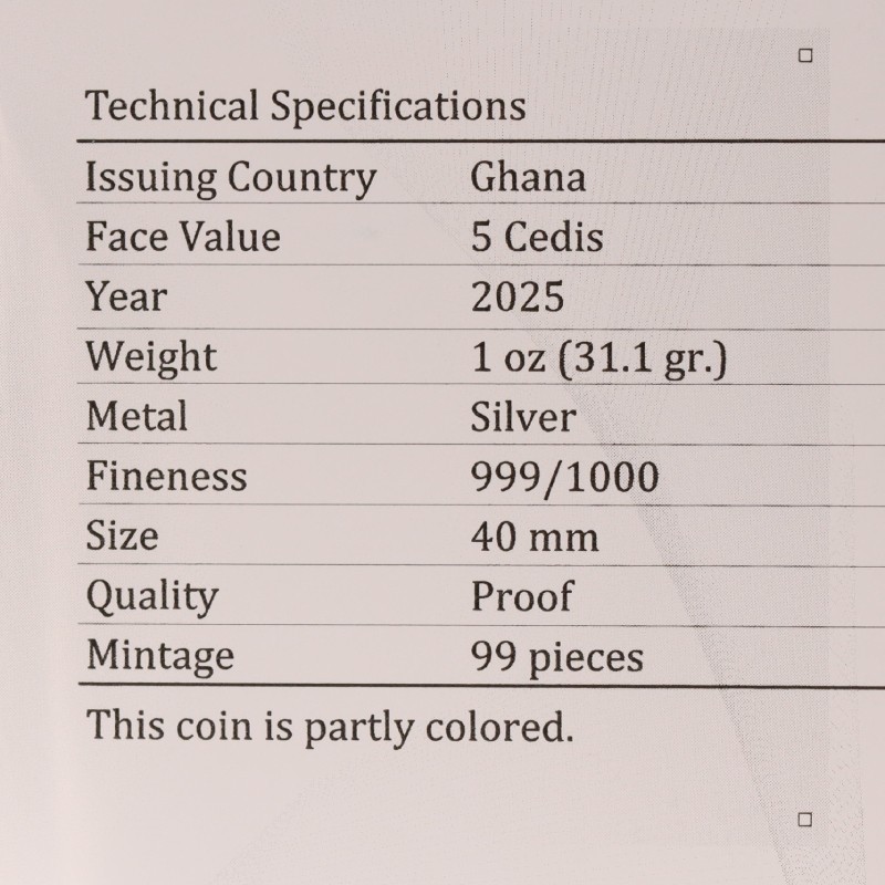 На аверсе монеты изображен государственный герб Ганы и надписи: REPUBLIC OF GHANA FIVE CEDIS 1 OZ.999 FINE SILVER 2025 (страна-эмитент, номинал, вес и проба серебра, год чеканки).