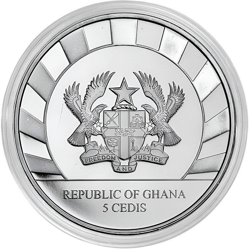 Лев в центре Георгиевского креста символизирует связь между Ганой и Содружеством наций. На гербе изображена Черная звезда Африки. Щит поддерживают два орла, на шее которых висит орден Звезды Ганы. Отделение, на котором стоят сторонники, представляет собой травянистое поле, под которым на свитке написан национальный девиз Ганы: FREEDOM AND JUSTICE (СВОБОДА И СПРАВЕДЛИВОСТЬ). Внизу название страны-эмитента: REPUBLIC OF GHANA, ниже которого номинал: 5 CEDIS. Обод вокруг сверху широкий и украшен широкими радиальными полосами.