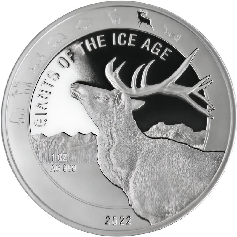 На реверсе изображен тундровый северный олень, его тело частично заслоняет обод. Вверху название серии — GIANTS OF THE ICE AGE. Слева от изображения в две строки указаны вес и проба серебра: 1 OZ AG 999 Внизу год чеканки - 2022. Вверху - общий элемент всех дизайнов серии: восемь пиктограмм, представляющих каждого из гигантов ледникового периода. Монета «Северный олень» является седьмой из них и выделяется тем, что изображение врезано в поверхность, в то время как остальные выполнены в рельефе.
