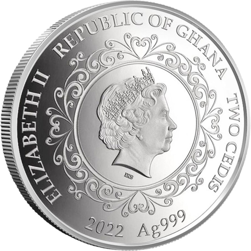 На аверсе в центре портрет Её Величества королевы Елизаветы II дизайнера Яна Рэнка-Бродли (IRB), окруженный декоративным орнаментом из завитков и сердец. Вдоль канта надписи: ELIZABETH II REPUBLIC OF GHANA TWO CEDIS 2022 Ag999 (Елизавета II, страна-эмитент, номинал, год чеканки, проба серебра).