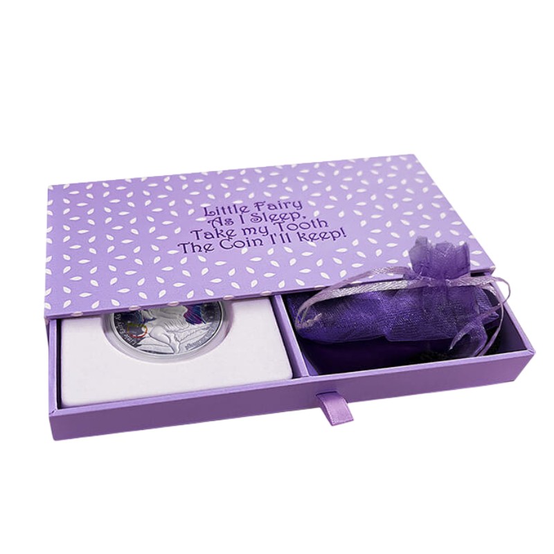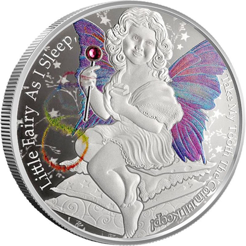 Эта чудесная серебряная монета посвящена волшебнице из детских сказок – Зубной фее. Согласно легенде, когда ребёнок теряет молочный зуб, он кладёт его под подушку, а ночью прилетает фея, заменяя зуб монеткой или небольшим подарком. Эта традиция помогает детям легче пережить процесс смены зубов, делая его радостным событием.
