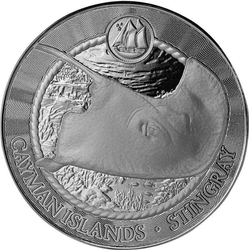 На реверсе изображен скат, плывущий в море. Вверху, в круге, изображен парусник и три звезды герба Каймановых островов. Внизу вдоль канта надпись: CAYMAN ISLANDS · STINGRAY (страна-эмитент, скат).