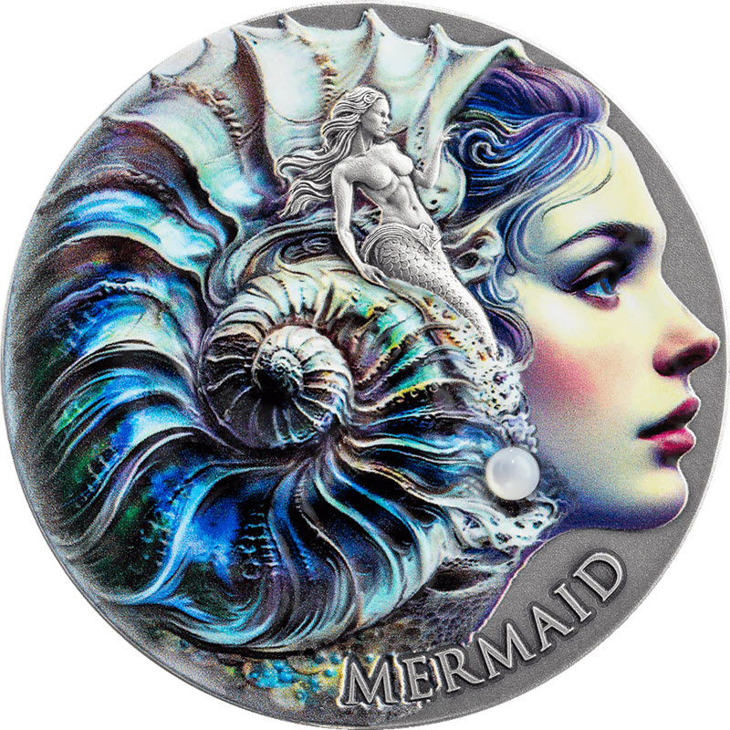 На реверсе изображен профиль русалки с раковиной-аммонитом перламутровой расцветки. Образ дополняет жемчужная вставка. Внизу надпись: MERMAID (морская дева).