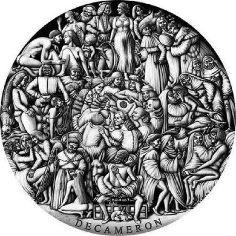 Эта серебряная монета «Декамерон» весом 5 тройских унций 2023 года представляет собой последнюю версию серии «Шедевры итальянской литературы». Монета весом 155,51 грамма чистого серебра (99,9%) посвящена шедевру: «Декамерону» Джованни Боккаччо. «Декамерон» — сборник из ста рассказов, написанных итальянским поэтом и учёным, вероятно, в период 1349–1360 годов. Это средневековое произведение считается его шедевром и стилистически считается одним из самых красивых произведений итальянской литературы.