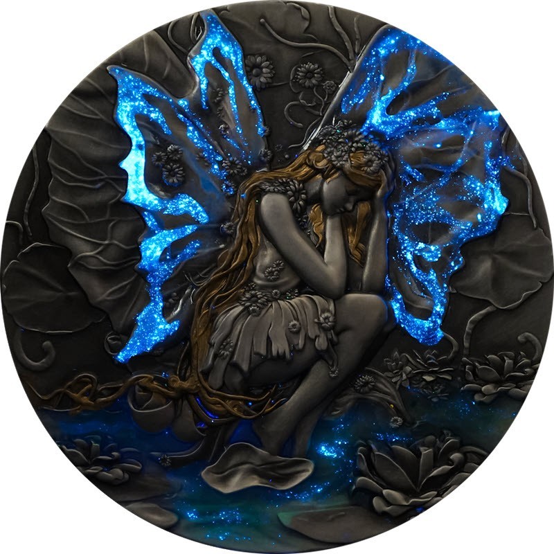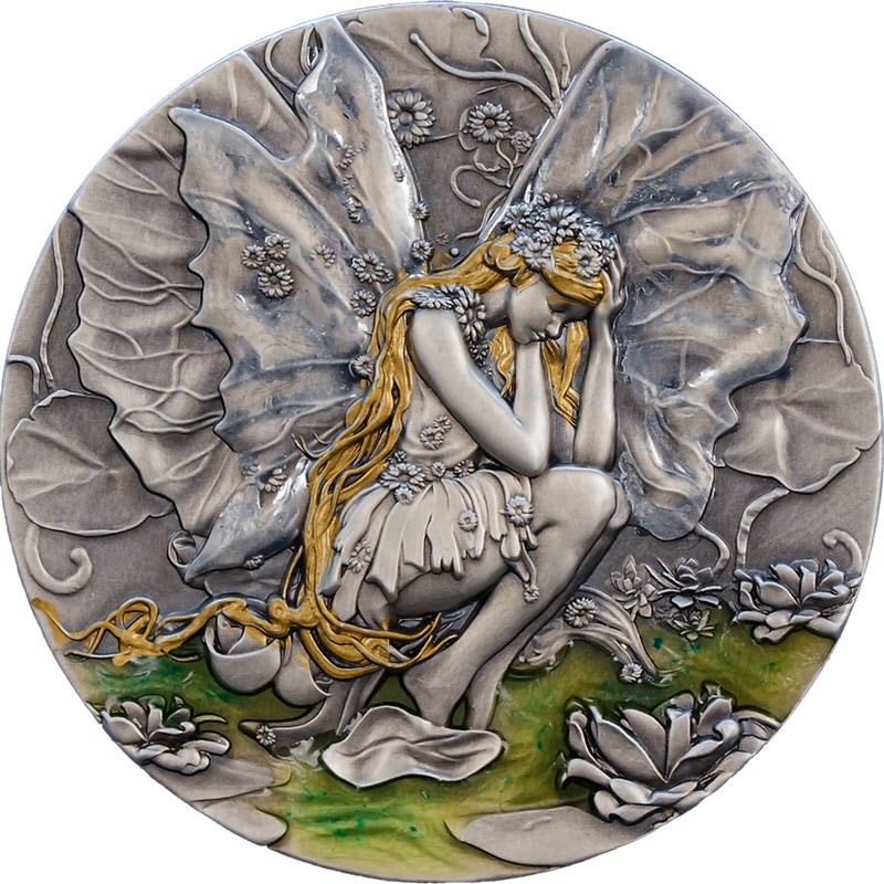 Эта удивительная серебряная монета весом в 2 унции – четвертая из серии «Магия», посвящена фее цветов. У нее качество античной отделки, высокий рельеф, выборочное золочение и свечение в ультрафиолете. Поставляется в оригинальном футляре с сертификатом подлинности. Тираж: 199 штук.
