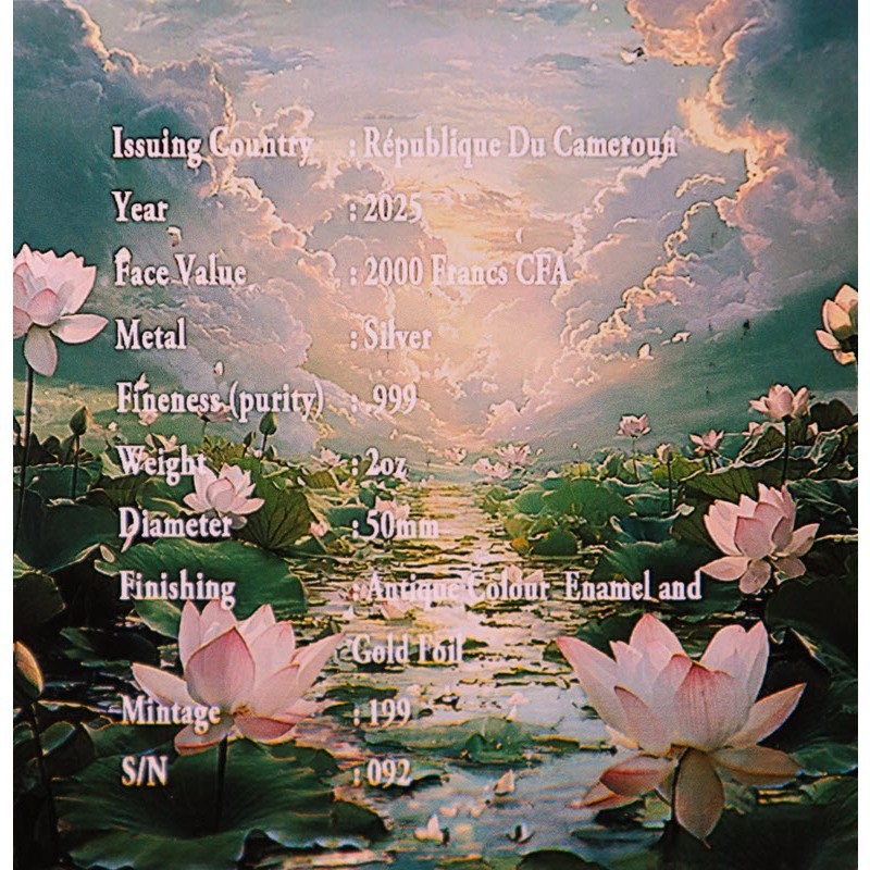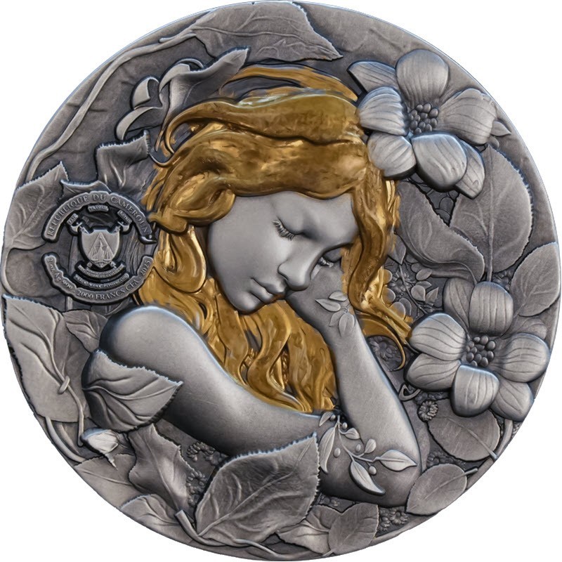 На аверсе изображена фея с позолоченными волосами на фоне цветов и листьев. Слева герб Камеруна. Вокруг герба надпись: REPUBLIQUE DU CAMEROUN 2oz Ag 999 · 2000 FRANCS CFA · 2025 (страна-эмитент, вес и проба серебра, номинал, год чеканки).
