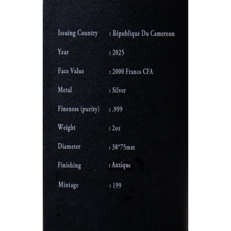 На аверсе изображен спящий ангел на фоне звуковых волн и музыкальных нот в виде крыльев ангела. Внизу герб Камеруна. Вокруг герба надпись: REPUBLIQUE DU CAMEROUN 2 OZ Ag 999 2000 FRANCS CFA 2025 (страна-эмитент, вес и проба серебра, номинал, год чеканки).