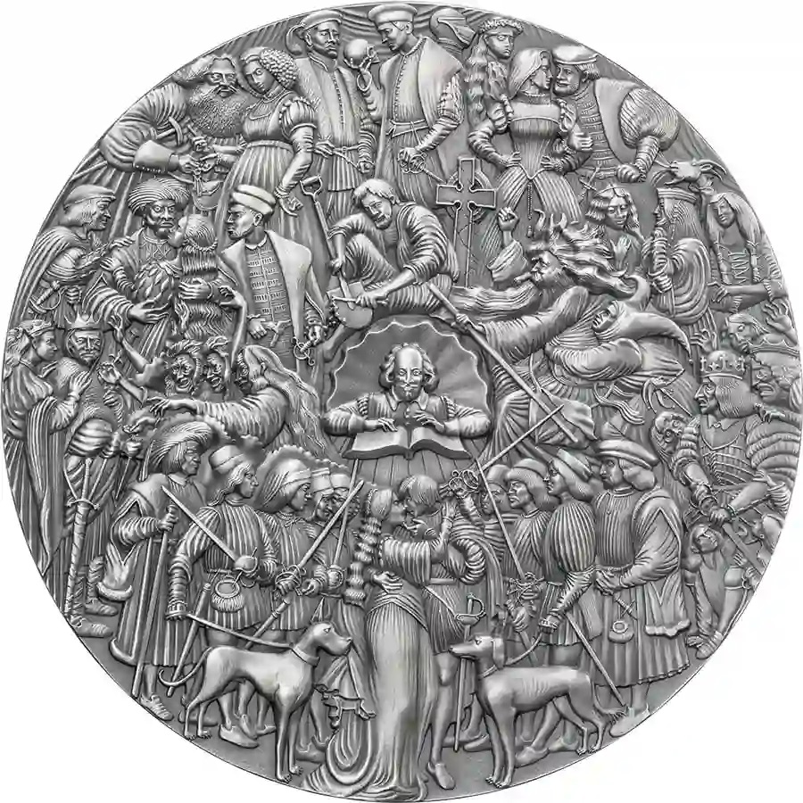 Эта серебряная монета весом в 5 унций посвящена известному писателю Уильяму Шекспиру и посвящена 400-летию Первого фолио, первого опубликованного сборника, выпущенного в 1623 году. Монета имеет античную отделку, невероятный дизайн с горельефами и поставляется в деревянном футляре в форме книги вместе с сертификатом подлинности. Ограниченный тираж 333 экземпляра по всему миру.