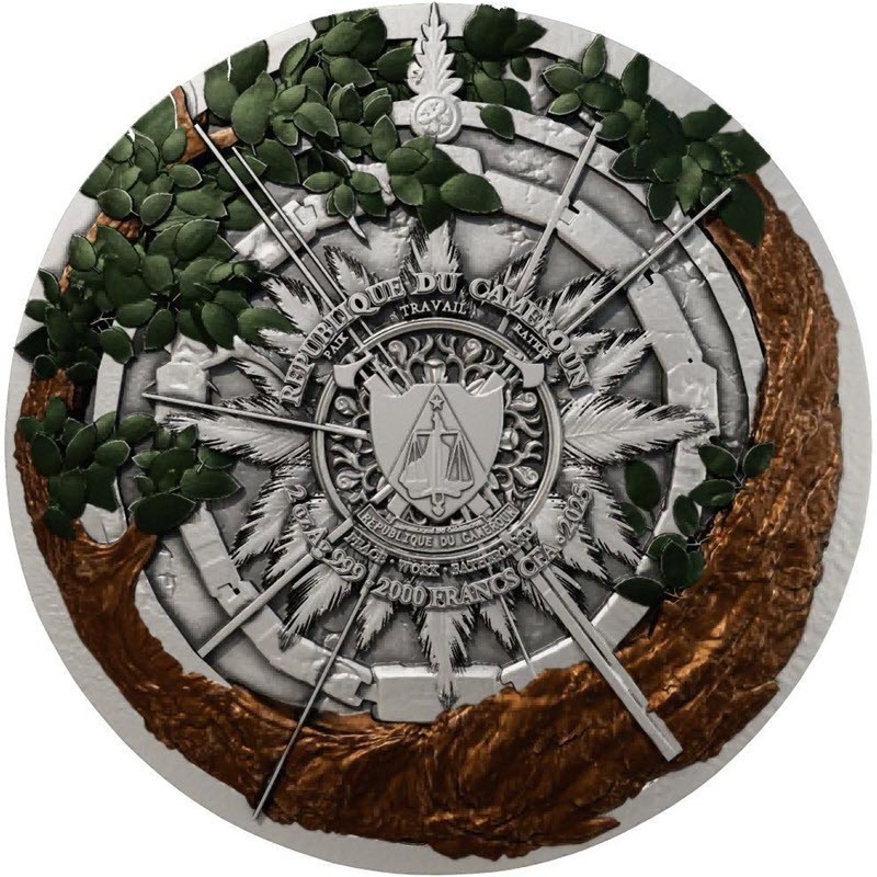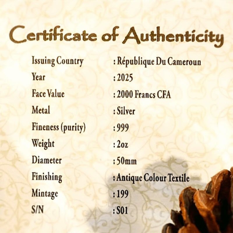 На аверсе изображен герб Камеруна на фоне стрел, каменной кладки и Шервудского леса. Вокруг герба надпись: REPUBLIQUE DU CAMEROUN 2 oz Ag 999 · 2000 FRANCS CFA · 2025 (страна-эмитент, вес и проба серебра, номинал, год чеканки).
