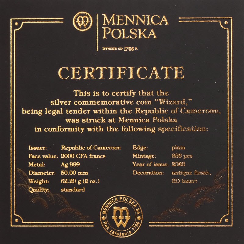 На этой потрясающей серебряной монете весом в 2 унции изображена фигура Волшебника, существа, способного влиять на реальность с помощью сверхъестественных сил! Монета с пронумерованным гуртом, античной отделкой и прекрасной флуоресцентной 3D-вставкой от польского монетного двора. Она поставляется в оригинальном футляре с сертификатом подлинности. Ограниченный тираж до 888 штук по всему миру.