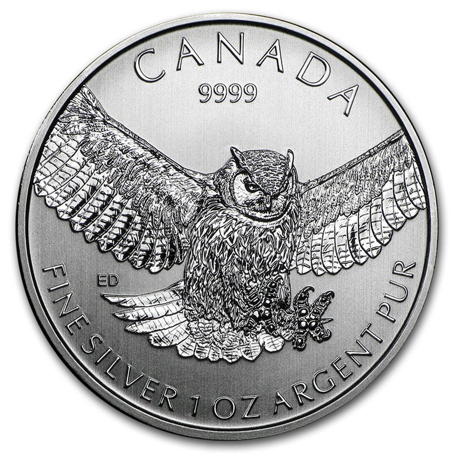 Реверс серебряной монеты: изображение совы в полете. Сверху - надписи "CANADA", "9999", внизу указан вес монеты (1 тройская унция - 31,1 г) и металл - чистое серебро.