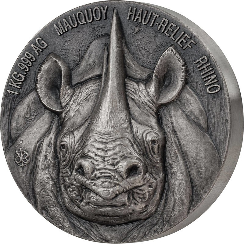 На реверсе изображена голова носорога. Вверху вдоль канта надпись: 1KG .999 AG MAUQUOY HAUT-RELIEF RHINO (вес и проба серебра, Бельгийский монетный двор, высокий рельеф, носорог).
