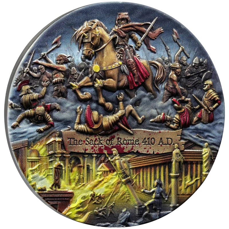 Эта удивительная серебряная монета весом 2 унции посвящена разграблению Рима в 410 году н. э. готами. У нее качество античной отделки и селективная окраска. Поставляется в оригинальном футляре с сертификатом подлинности. Тираж: 500 штук.