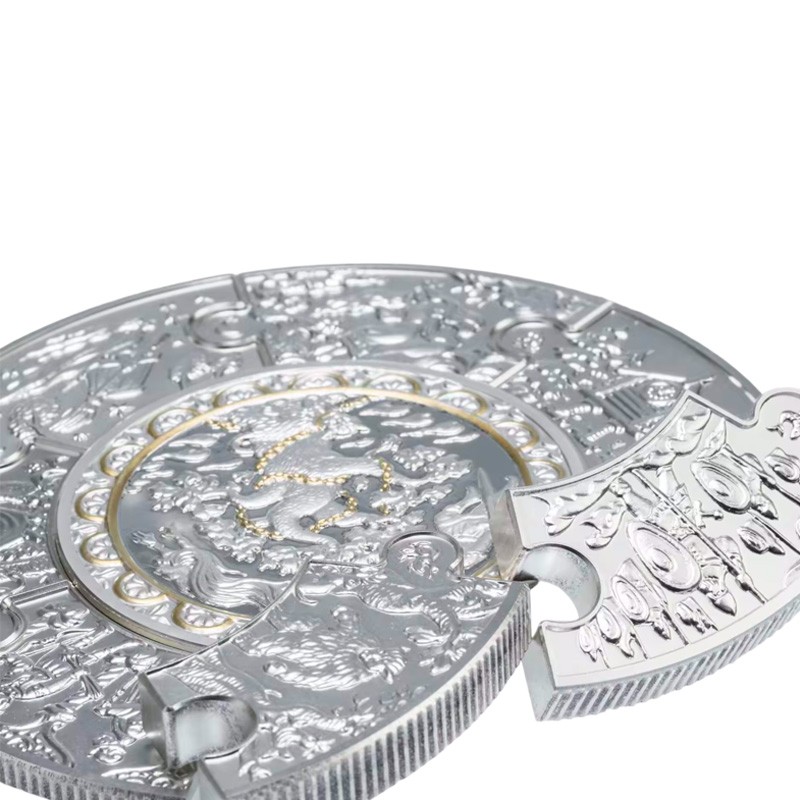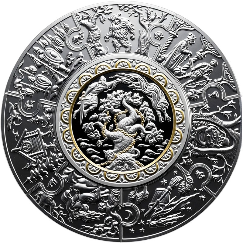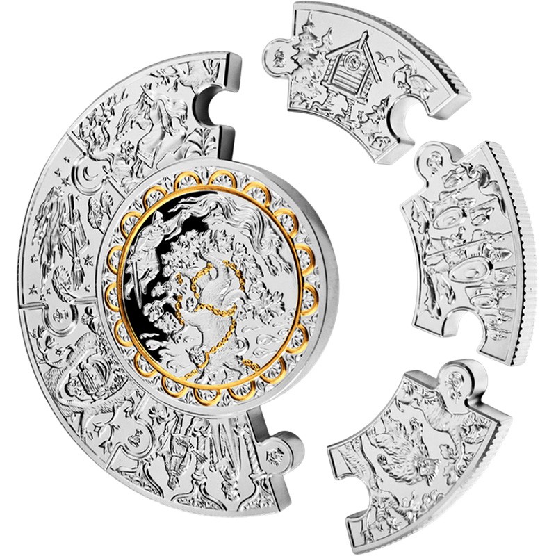 Эта уникальная серебряная монета в форме пазла общим весом 1000 г чистого серебра 999 пробы состоит из 8 элементов — центральной круглой монеты и 7 окружающих её пазлов. Дизайн вдохновлен творчеством А. С. Пушкина и работами знаменитого иллюстратора Ивана Билибина.