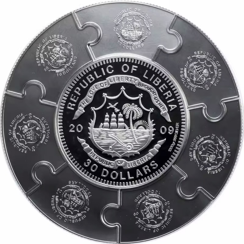 Аверс центральной круглой монеты и каждого отдельного пазла показывает государственный герб Республики Либерия. Над гербом на ленте надпись: THE LOVE OF LIBERTY BROUGHT US HERE (Любовь к свободе привела нас сюда), а под ним: REPUBLIC OF LIBERIA (Республика Либерия). Год чеканки – 2009, поделен наполовину гербом. Вверху над гербом - REPUBLIC OF LIBERIA (страна-эмитент). На центральном круглом элементе справа надпись: 1000g .999 SILVER (вес и проба серебра).