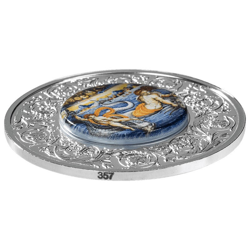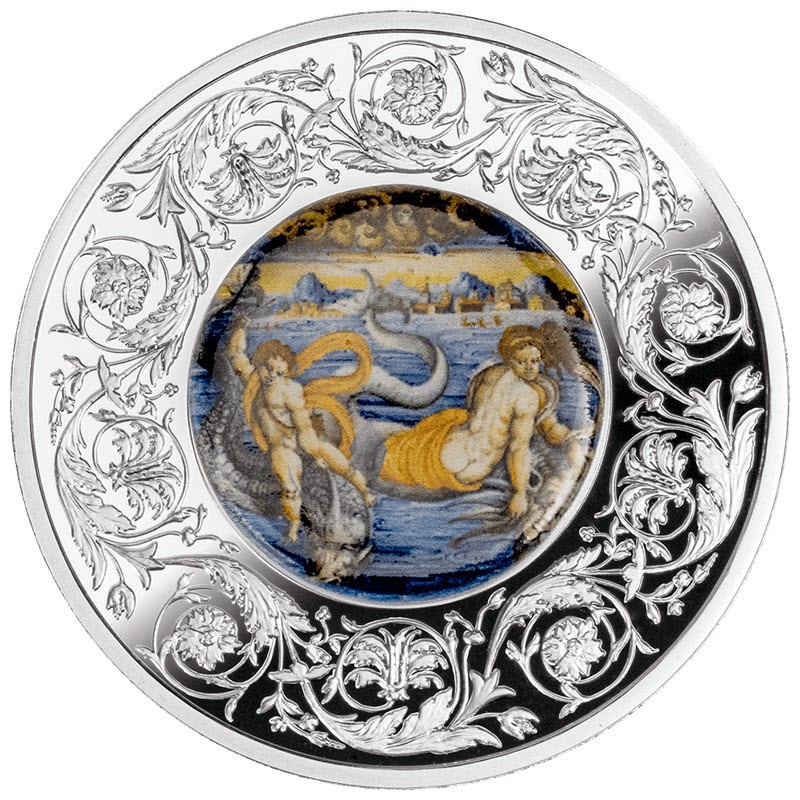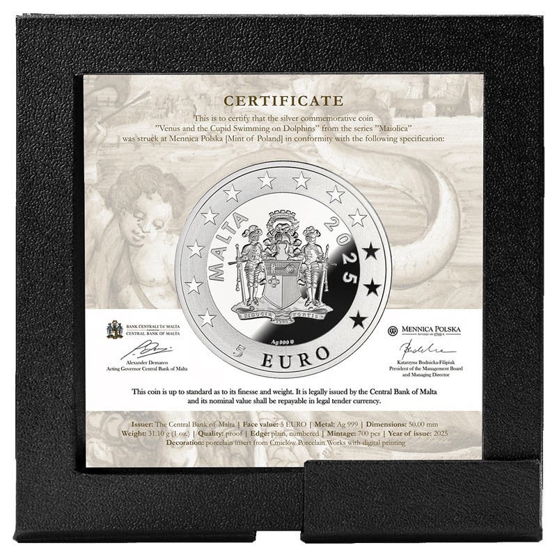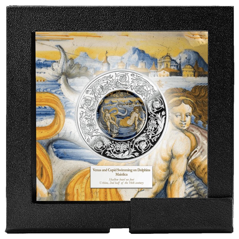 Эта чудесная серебряная монета Мальты из серии «Майолика» посвящена Венере и Купидону. В центре вставка из фарфора ручной росписи от Польских фабрик "Ćmielów" и "Chodzież". У нее качество пруф и селективная окраска. На гурте индивидуальный номер монеты. Поставляется в оригинальном футляре с сертификатом подлинности. Тираж: 700 штук.