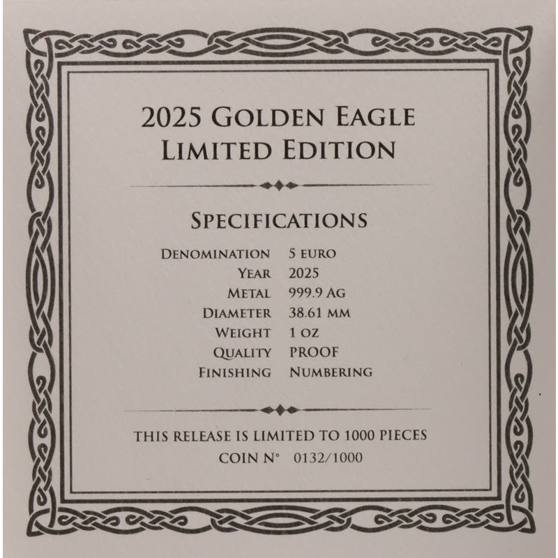 На реверсе изображена битва мощного Орла с опасным и злобным Змием на фоне стилизованных морских вод Средиземноморья. Вверху вдоль канта надпись: · GOLDEN EAGLE · , внизу: · 2025 · (год чеканки).