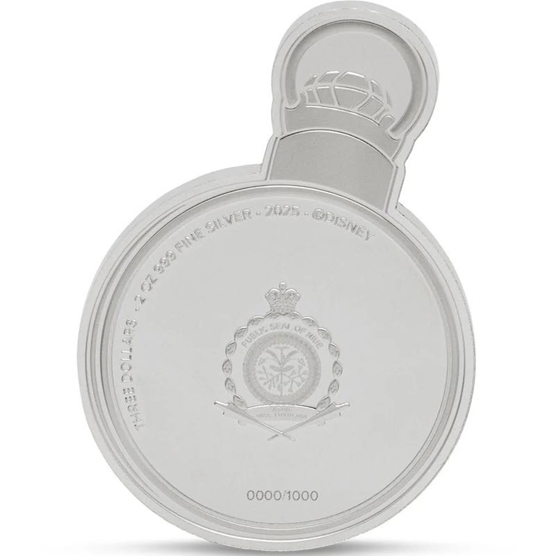На аверсе изображена неофициальная «Государственная печать Ниуэ». Вдоль канта надпись: THREE DOLLARS · 2 OZ 999 FINE SILVER · 2025 · ©DISNEY 0000/1000 (номинал, вес и проба серебра, год чеканки, логотип компании, индивидуальный номер монеты).