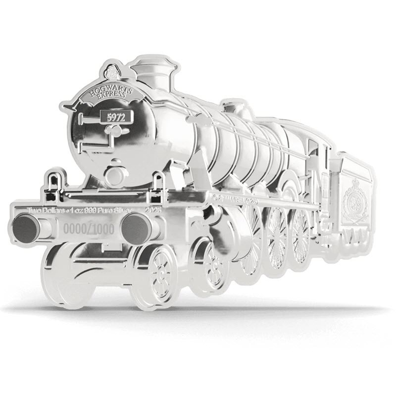 На аверсе на лицевой стороне паровоза надпись: HOGWARTS EXPRESS 5972 Two Dollars · 1 oz 999 Pure Silver 2025 хххх/1000 (Хогвартс-экспресс и его номер, номинал, вес и проба серебра, год чеканки, индивидуальный номер монеты). На боку надпись: © & ™ WBEI. (s25) (авторские права). На тендере изображен герб Ниуэ.