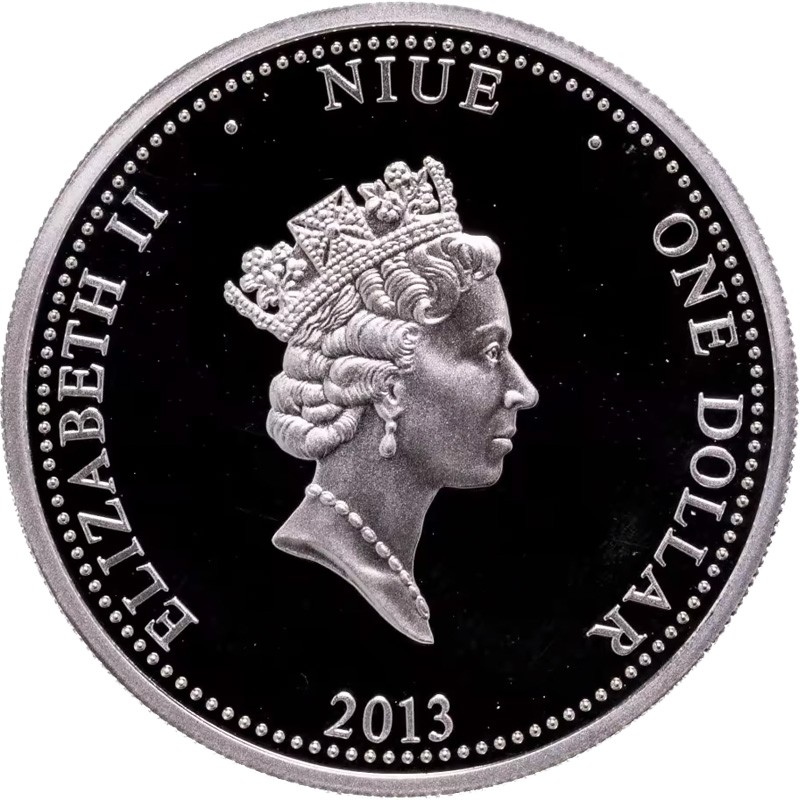В центре - портрет Ее Величества Королевы Елизаветы II работы дизайнера Рафаэля Маклауфа (RDM). Вдоль канта полукругом надписи – ELIZABETH II · NIUE · ONE DOLLAR 2013 (Елизавета II, страна-эмитент, номинал, год чеканки).