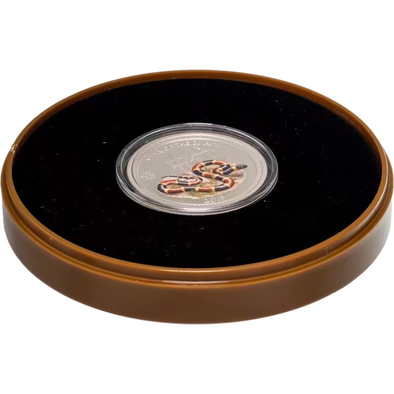 В центре расположено цветное изображение Арлекинового кораллового аспида в естественной среде обитания. Вверху надпись - YEAR OF THE SNAKE (Год Змеи) и китайский иероглиф 蛇 («Змея»). Слева надпись в три строки - .999 SILVER 1/2 oz (вес и проба серебра), внизу – 2013 – год чеканки.