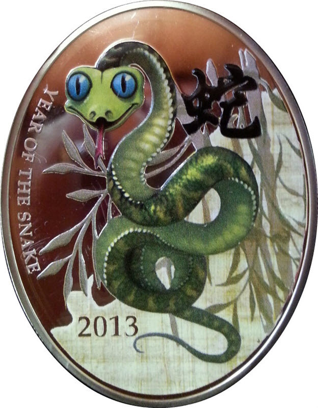 Серебряная монета "Год Змеи. Китайская Змея" посвящена символу 2013 года - Змее. У нее овальная форма размером 35.1 Х 45.1 мм и качество пруф. Тираж: 3000 штук.