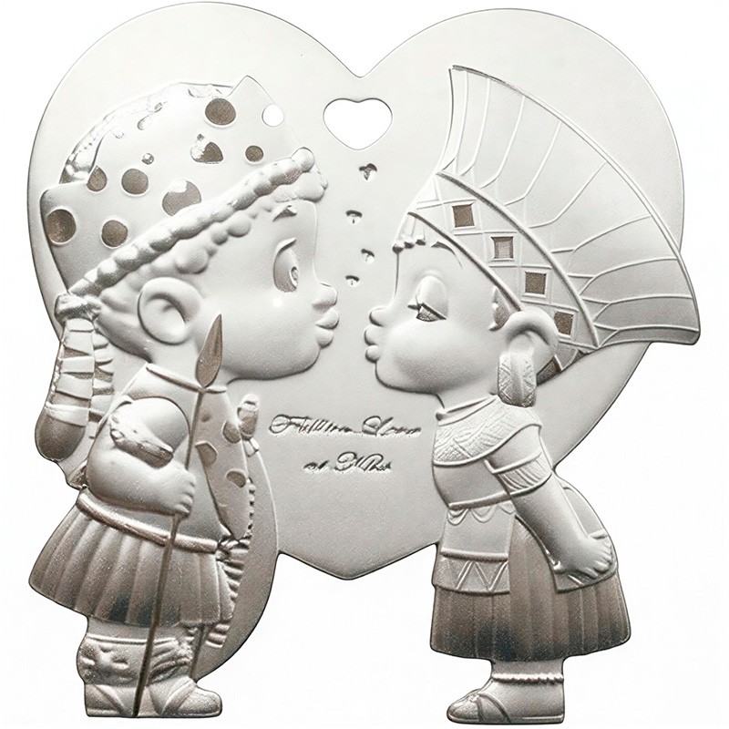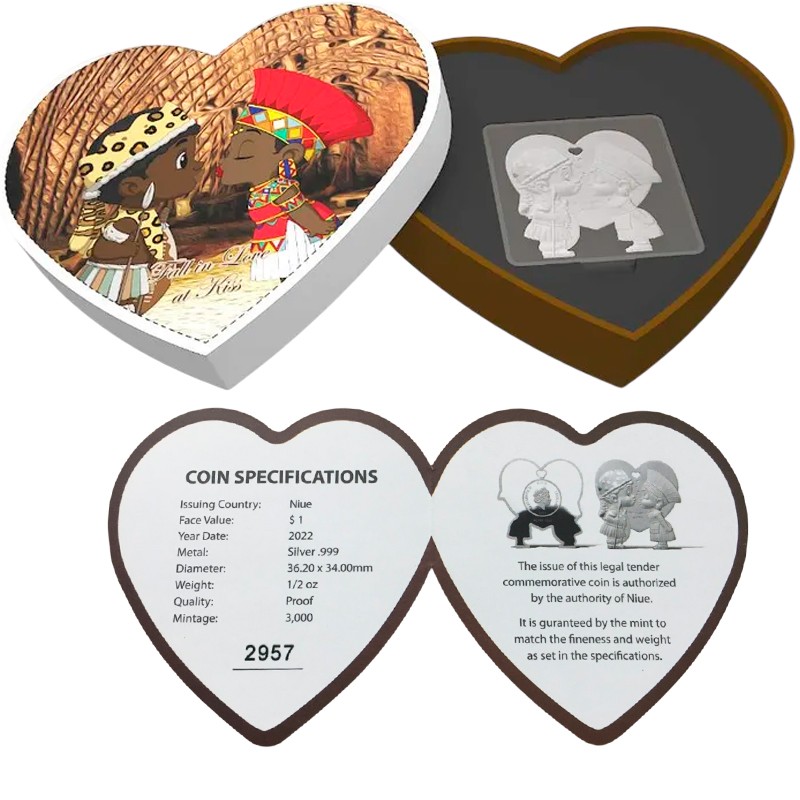 Эта чудесная серебряная монета весом в пол унции необычной формы из серии «Fall in Love at Kiss» («Влюбиться с первого поцелуя») посвящена теме любви.