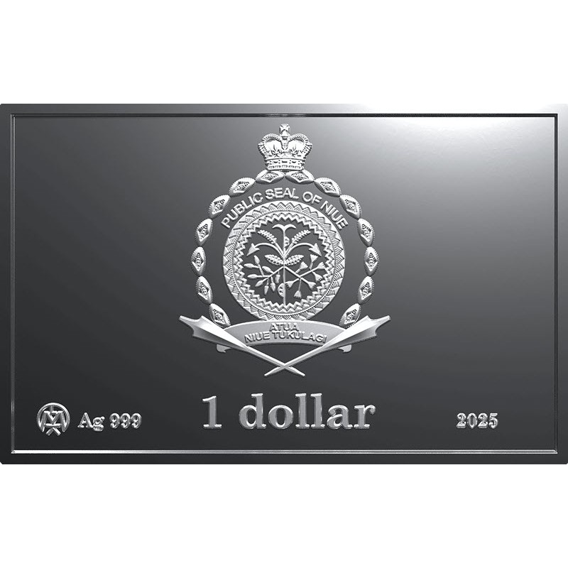 На аверсе изображена неофициальная «Государственная печать Ниуэ». Внизу надпись: LM Ag999 1 dollar 2025 (монограмма Литовского монетного двора, проба серебра, номинал, год чеканки).