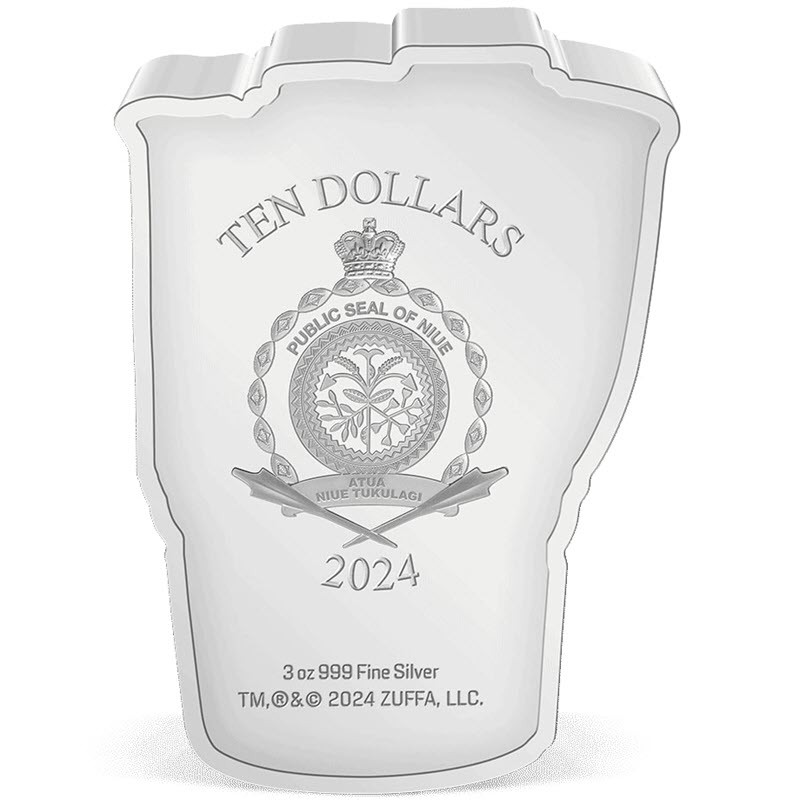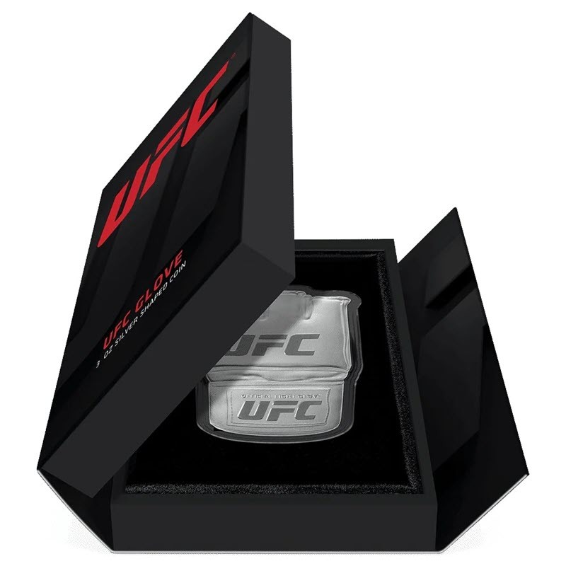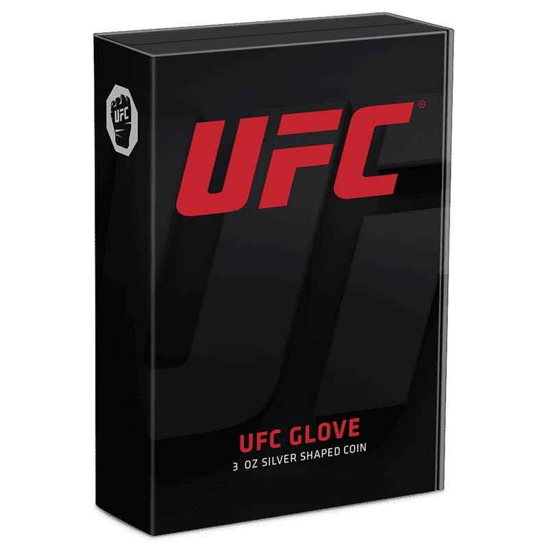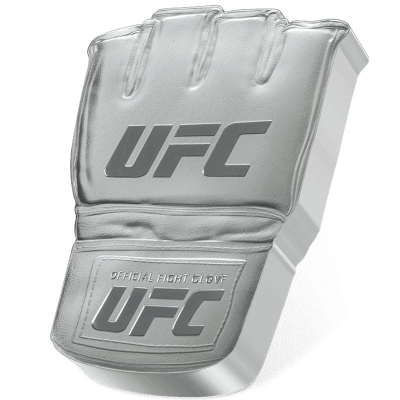 Эта потрясающая серебряная монета весом в 3 унции сделана в форме перчатки UFC. У нее размеры 40,6 х 55 мм и качество пруф. Поставляется в оригинальном футляре с сертификатом подлинности. Тираж: 1000 штук.