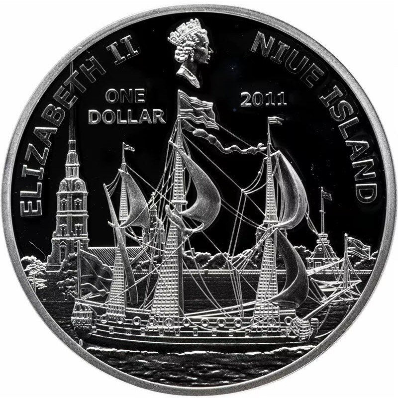 На аверсе изображен корабль «Гото Предестинация» на фоне Петропавловской крепости. Вверху изображена королева Елизавета II с бриллиантовой диадемой и жемчужным ожерельем, дизайнер Рафаэль Дэвид Маклауф (Raphael David Maklouf). Вдоль канта надпись: ELIZABETH II NIUE ISLAND ONE DOLLAR 2011 (Елизавета II, страна-эмитент, номинал, год чеканки).