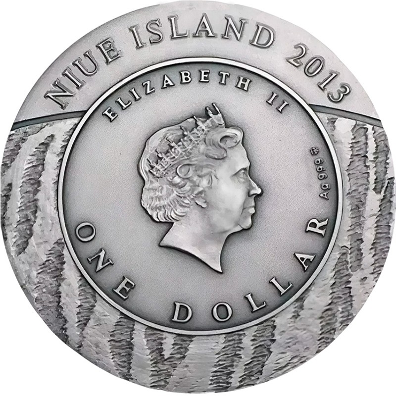 В центре во внутреннем круге - профиль королевы Елизаветы II дизайнера Яна Рэнка-Бродли. Вокруг портрета надписи: ELIZABETH II ONE DOLLAR Ag 999 m/w (Елизавета II, номинал, проба серебра, монограмма монетного двора). Во внешнем круге вверху надпись: NIUE ISLAND 2013 (страна-эмитент, год чеканки).