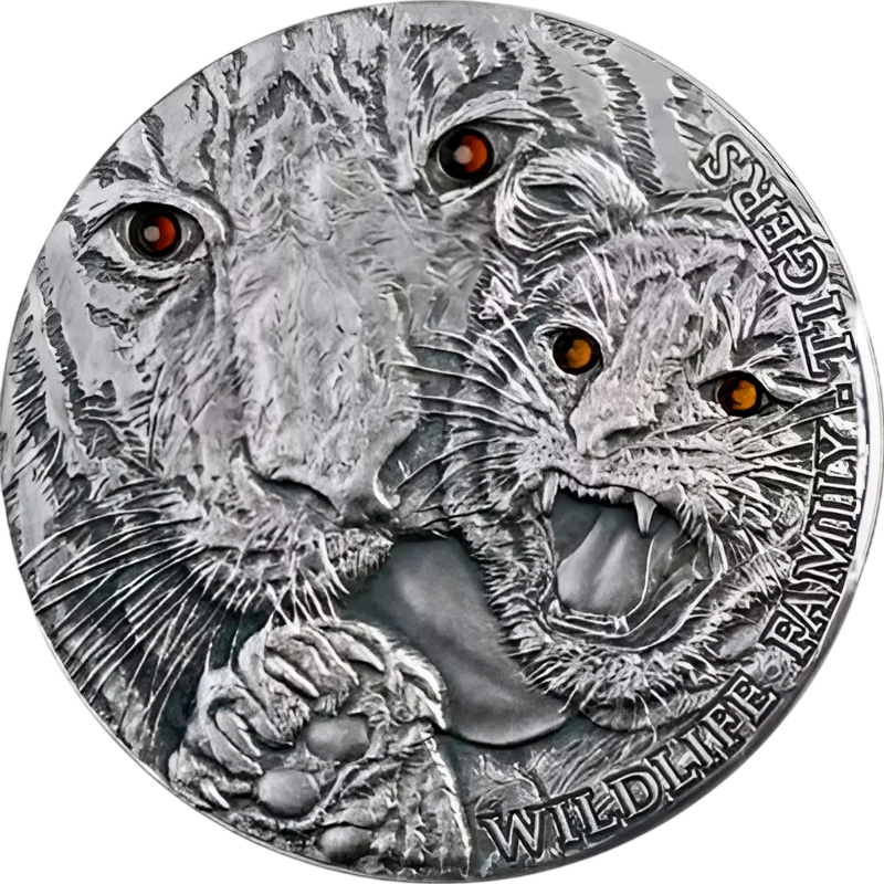 Эта чудесная серебряная 1 унцовая монета Польского монетного двора из серии «WILDLIFE FAMILY» (Семья диких животных) посвящена тиграм.