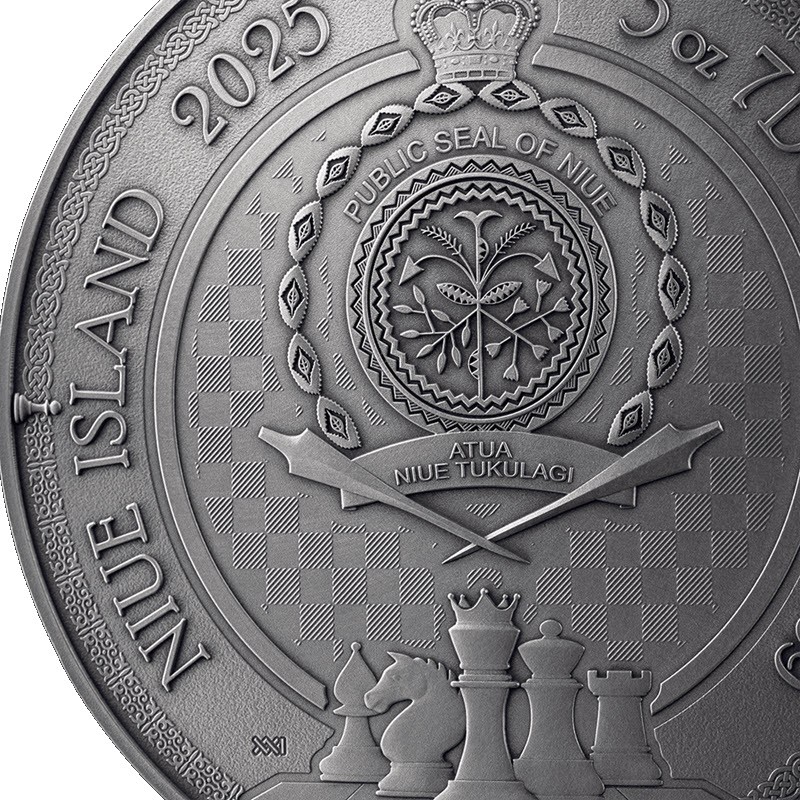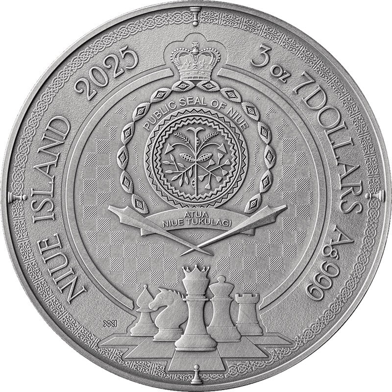 На аверсе в центре изображена неофициальная «Государственная печать Ниуэ». Это  композиция из растений в центре внутри двойного декоративного круга, окруженного морскими раковинами. Он увенчан короной Святого Эдуарда (символом Соединенного Королевства, монарх которого в конечном итоге является главой государства Ниуэ). Сверху между ними надпись PUBLIC SEAL OF NIUE. Ниже на ленте в две строки изображен девиз ATUA NIUE TUKULAGI, ниже которых две перекрещенные катуа. Вдоль канта надпись: NIUE ISLAND 2025 3 oz 7 DOLLARS Ag 999 (страна-эмитент, год чеканки, вес и проба серебра, номинал). Внизу шахматные фигуры.