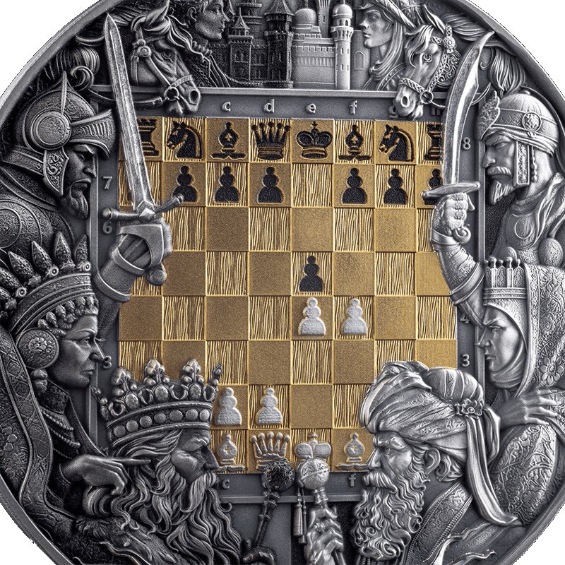 Серебряная монета Ниуэ "Шахматная битва. Королевский гамбит" 2025 г.в., 93.3 г серебра (проба 999)