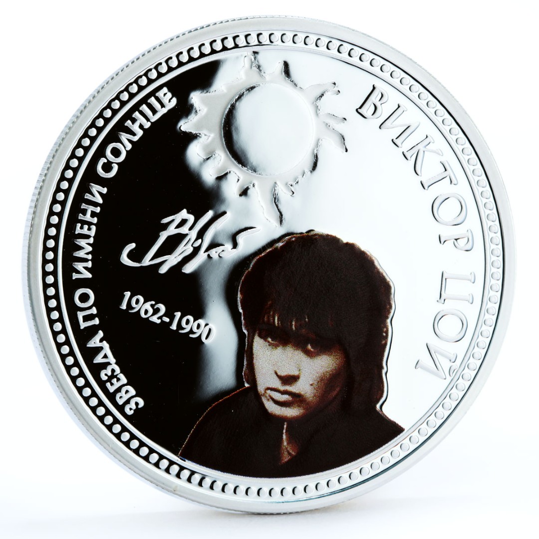 Серебряная монета, посвященная рок-певцу Виктору Цою. Монета в качестве «PROOF» с сертификатом и в футляре.