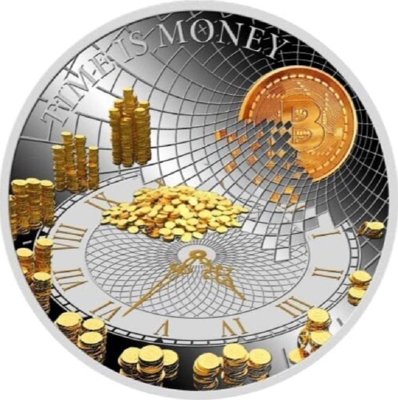 На реверсе монеты изображено сосуществование традиционной и цифровой валюты. В верхней части надпись: "TIME IS MONEY" - название монеты.