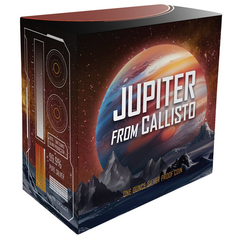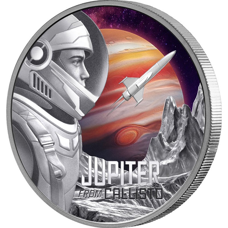 Эта чудесная серебряная монета весом 1 унция посвящена небесным телам Солнечной системы – планете-гиганту Юпитеру и его спутнику Каллисто. У нее качество пруф и селективная окраска. Поставляется в оригинальном футляре с пронумерованным сертификатом подлинности. Тираж: 999 штук.