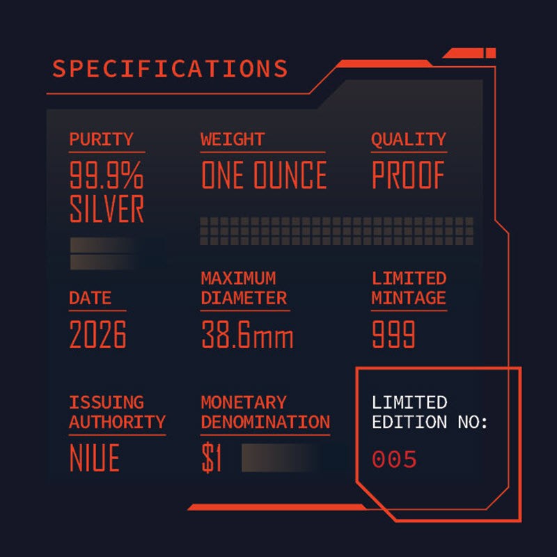 На аверсе изображен Его Величество король Чарльз III. На усечении шеи инициалы дизайнера JC (Jody Clark). Вдоль канта надпись: CHARLES III · NIUE 2026 · ONE DOLLAR · 1oz 999 SILVER · (Чарльз III, страна-эмитент, год чеканки, номинал, вес и проба серебра).